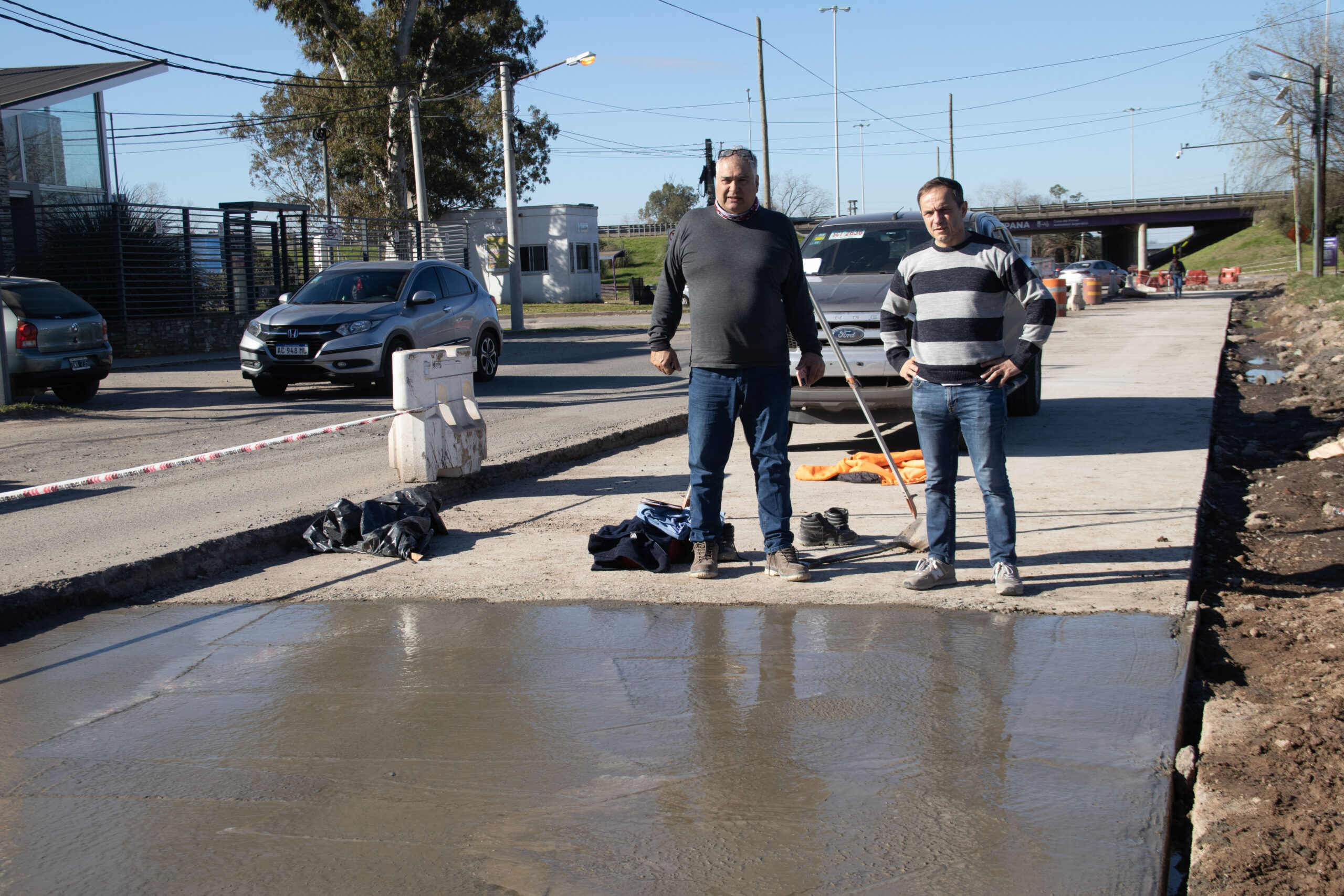 Abella estuvo presente en el comienzo de la colocación del hormigón sobre la calzada. La primera etapa del proyecto abarcará unos tres kilómetros, desde Colectora Panamericana hasta Río Luján.