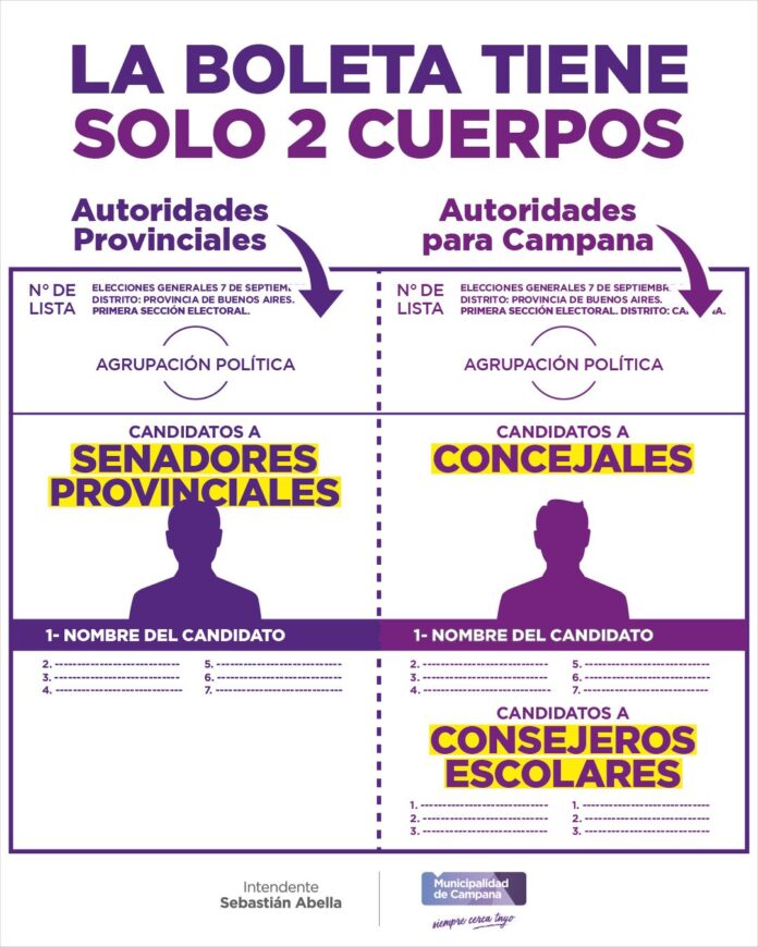 En nuestra ciudad, la sección de la boleta correspondiente a Campana será para elegir 10 concejales que renovarán la mitad del Honorable Concejo Deliberante (HCD) y 3 consejeros escolares que renovarán la mitad del Consejo Escolar.
