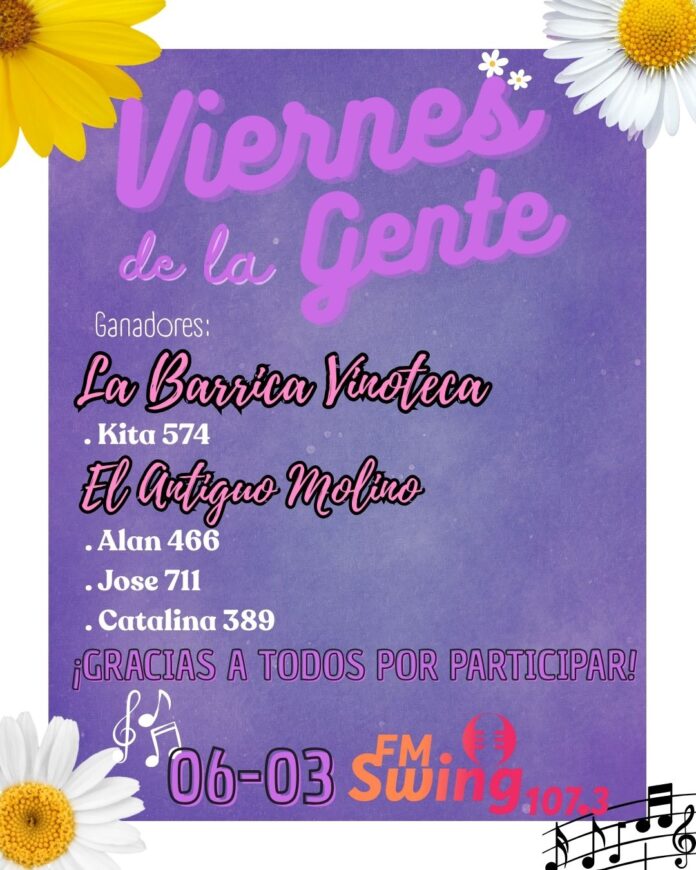 Locales GANADORES DEL PRIMER «VIERNES DE LA GENTE» DEL AÑO!!! Por fmswing - 6 marzo, 2026 0 4 FacebookTwitterPinterestWhatsApp Gracias a todos por participar. Hata la semana que viene!