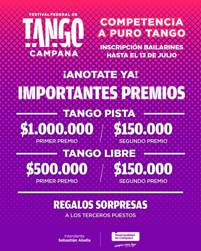 Según se informó, habrá competencia en dos categorías que repartirán importantes premios donados por empresas de la zona: Tango Pista Adulto – 18 A 50 años- y Senior – + de 56 años- entregará $1.000.000 como primer premio y $150.000 como segundo premio; mientras que Tango Libre (tango, milonga y vals) Adulto – 18 a 54 años- entregará $500.000 como primer premio y Senior (+ de 55 años), $150.000.