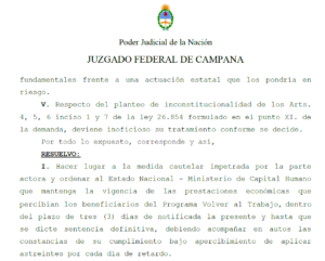 | Ante la medida cautelar por el pago del programa Volver al Trabajo y el comunicado del ministerio de Capital Humano sobre apelar y acatar la medida, aunque implique “consecuencias sobre el presupuesto”, Mónica Sulle, coordinadora del MST Teresa Vive, integrante de Territorios en Lucha y de la unidad de organizaciones sociales, señaló: “Basta de mentiras, la (in)humana ministra Sandra Pettovello debe pagar el Volver al Trabajo a casi un millón de familias, aunque apelen. La cautelar no tiene efecto suspensivo, deben pagar al conjunto porque es una resolución de alcance colectivo. La justicia nos dio la razón por el carácter alimentario, de subsistencia de los $78 mil al mes, ante nuestra justa lucha”.