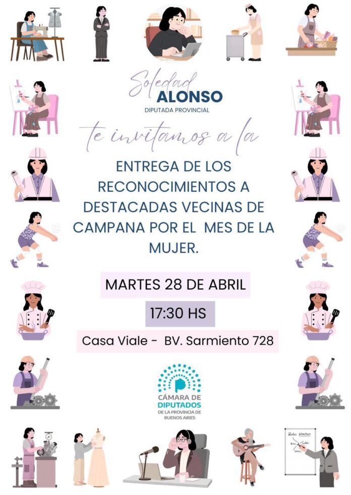 Como parte de una iniciativa que se sostiene desde hace varios años, la diputada provincial Soledad Alonso llevará adelante la edición 2026 del reconocimiento a mujeres destacadas de Campana. La actividad se realizará el próximo martes 28 de abril, a las 17:30 hs, en Casa Viale, ubicada en Bv. Sarmiento 728, Campana.